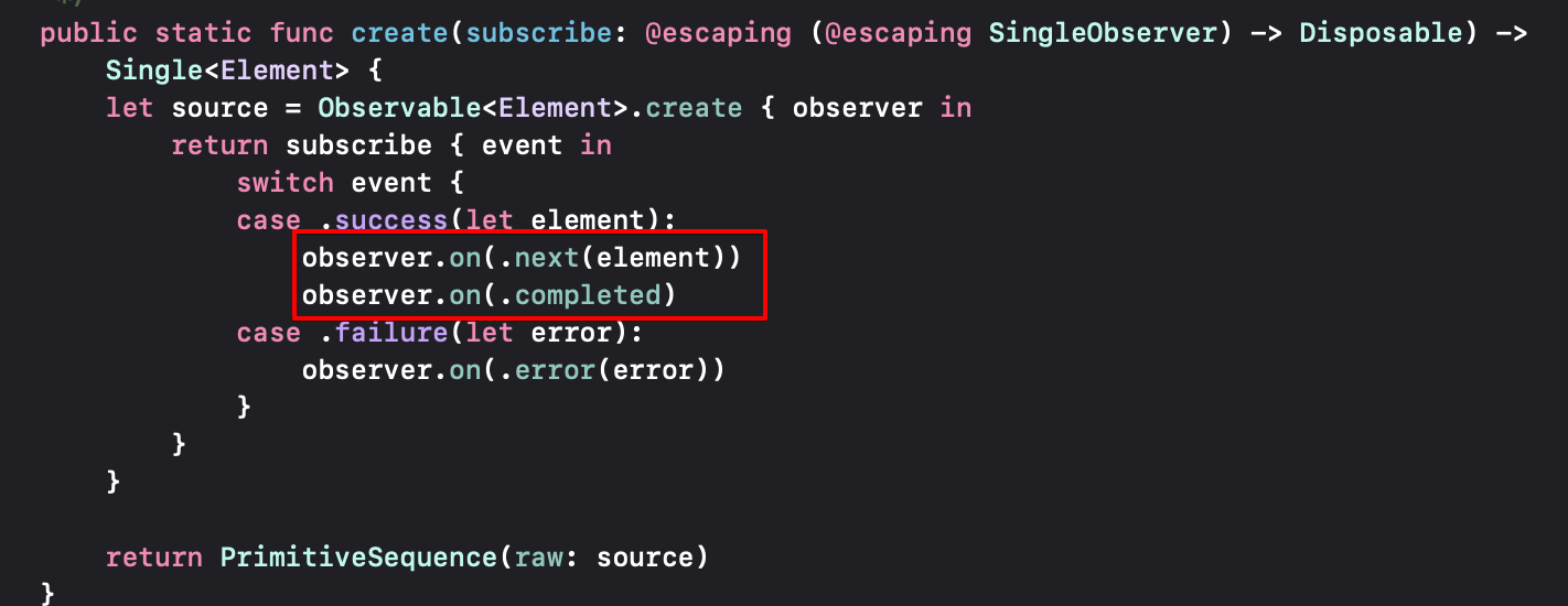 single 내부 코드를 보면 .success() 이벤트 방출 시 .next와 .completed를 동시에 수행하는 것을 볼 수 있다.