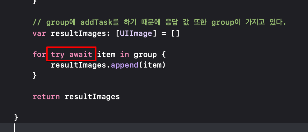 group.addTask { // 네트워크 통신이 몇 번 일어날 지 모르니까 그룹으로 묶기 위해 addTask