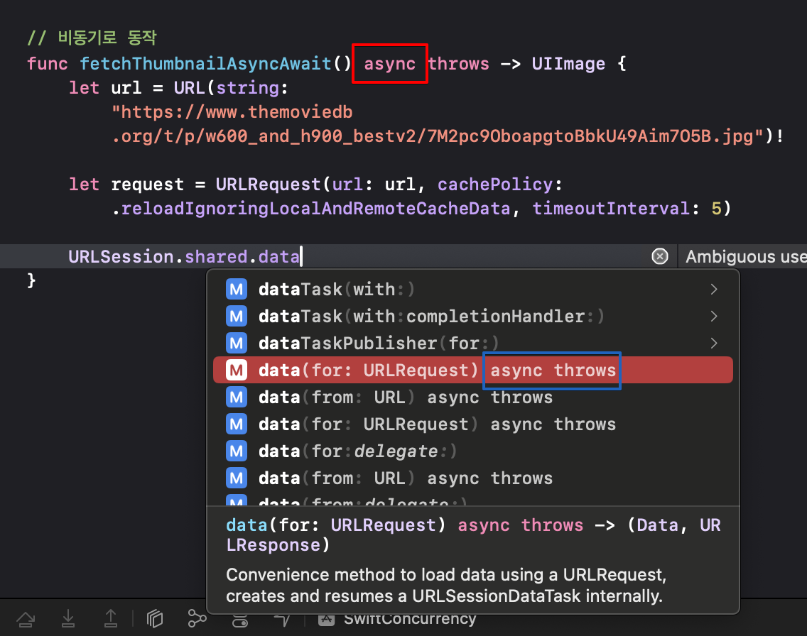 Swift Concurrency를 사용할 것이기 때문에 기존에 URLSession에서 사용하던 dataTask 메서드가 아니라 URLSession이 가지고 있는 메서드들 중에 swift concurrency로 동작하는 메서드를 선택