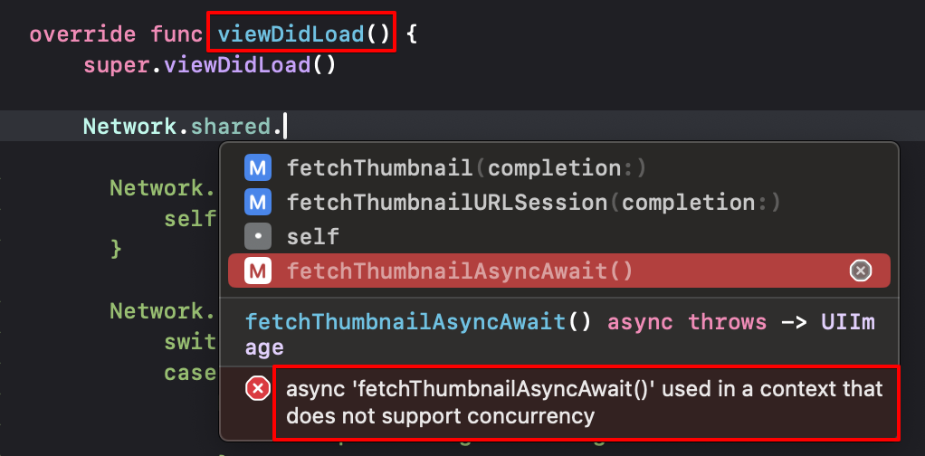 viewDidLoad()는 당연히도 동기로 동작하는 메서드이다. 동기로 동작하는 메서드 내에서 비동기 메서드를 호출할 수 없다. 비동기로 동작하기로 약속을 해버렸으니까..!